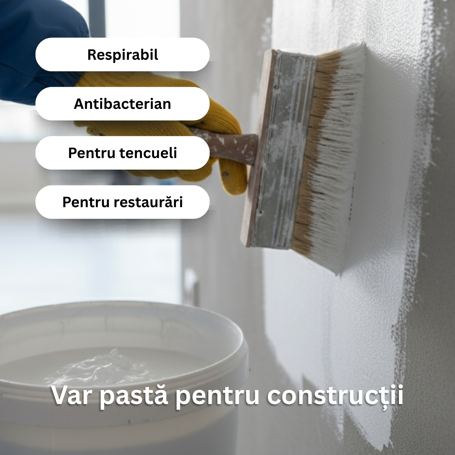Varul pastă GIMI este maturat natural, filtrat fin și conține peste 90% hidroxid de calciu pur. Este 100% ecologic, fără mirosuri chimice și complet respirabil, spre deosebire de vopselele lavabile sintetice care pot bloca pereții și favoriza mucegaiul.